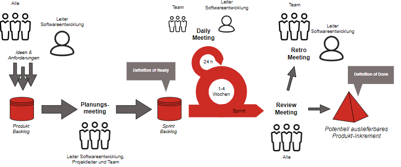 Nach dem Sprint-Planning wird der zweiwöchige Sprint gestartet und den Team-Mitgliedern steht offen, wie sie ihre Aufgaben ideal auf den Sprint-Zeitraum aufteilen.